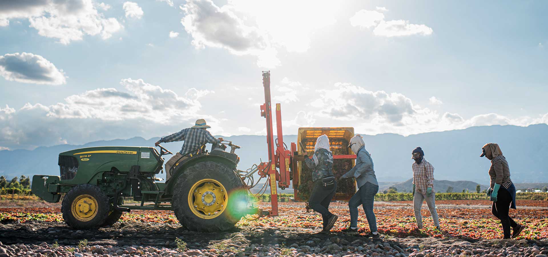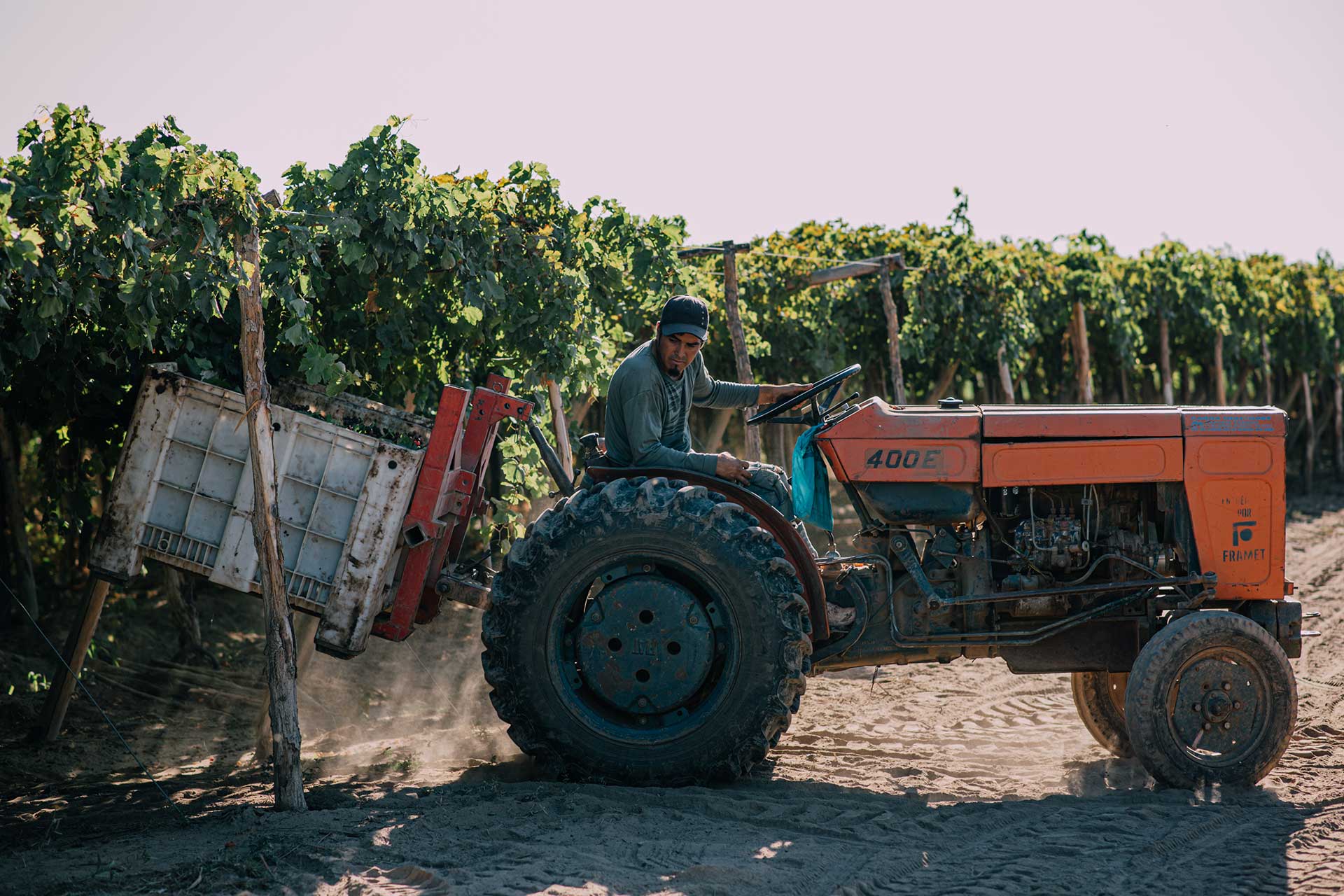 Las uvas se cosechan cuando alcanzan su estado óptimo de contenido de azúcar, esto se da a partir de mediados de enero hasta el mes de marzo. Los racimos son cortados a mano por los trabajadores rurales y puestos en cajones, luego son paletizados para su traslado al secadero. El secadero está construido completamente de piedras limpias, para asegurar un secado homogéneo y, en caso de lluvias, un escurrimiento del agua en forma inmediata. Al llegar al secadero se descargan los pallets y se colocan los racimos de uva sobre rejillas, para su exposición al sol. Allí las uvas se dejan secar de 2 a 3 semanas, de esta manera su contenido de humedad se reduce de un 75% a menos del 15%. Una vez en el punto de secado óptimo, el personal del secadero las recolecta y coloca en bines para su traslado a la planta. Entonces son fumigadas y almacenadas en galpones, para finalmente ser procesadas.